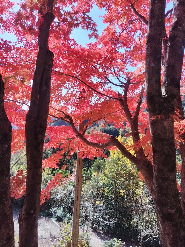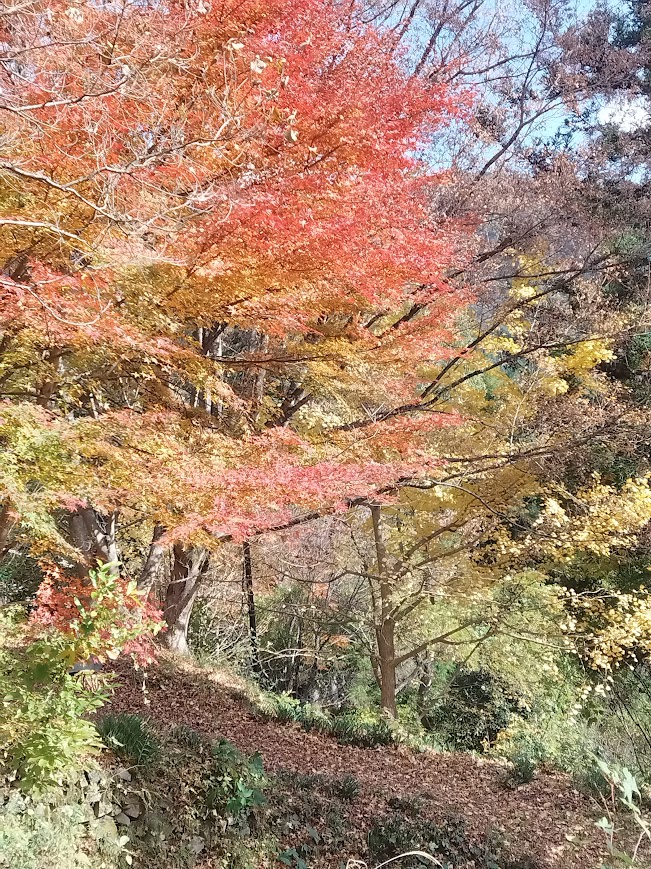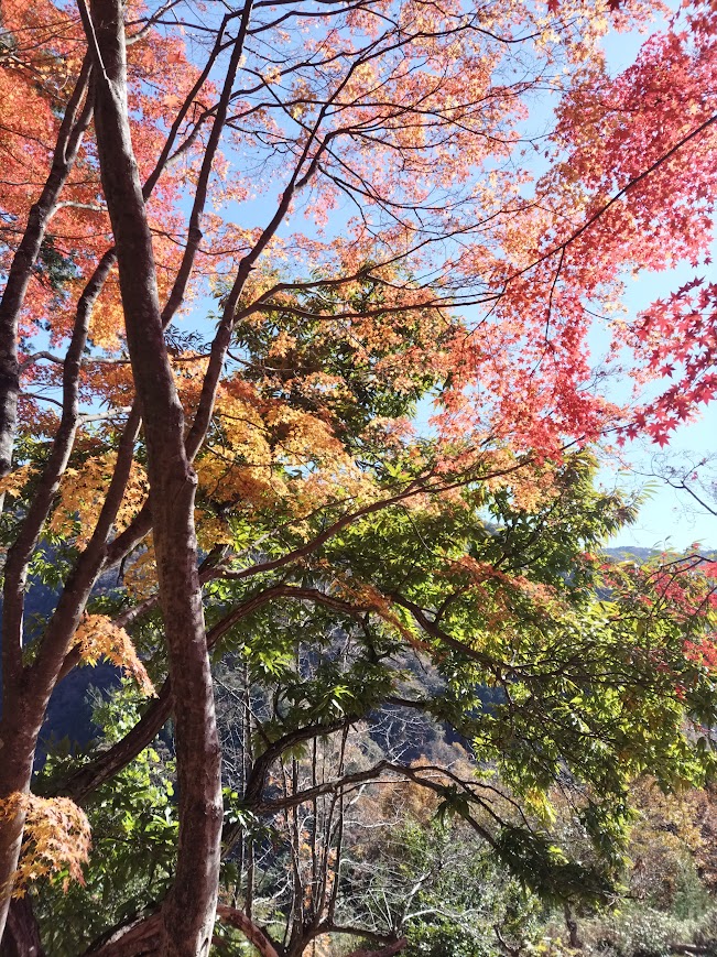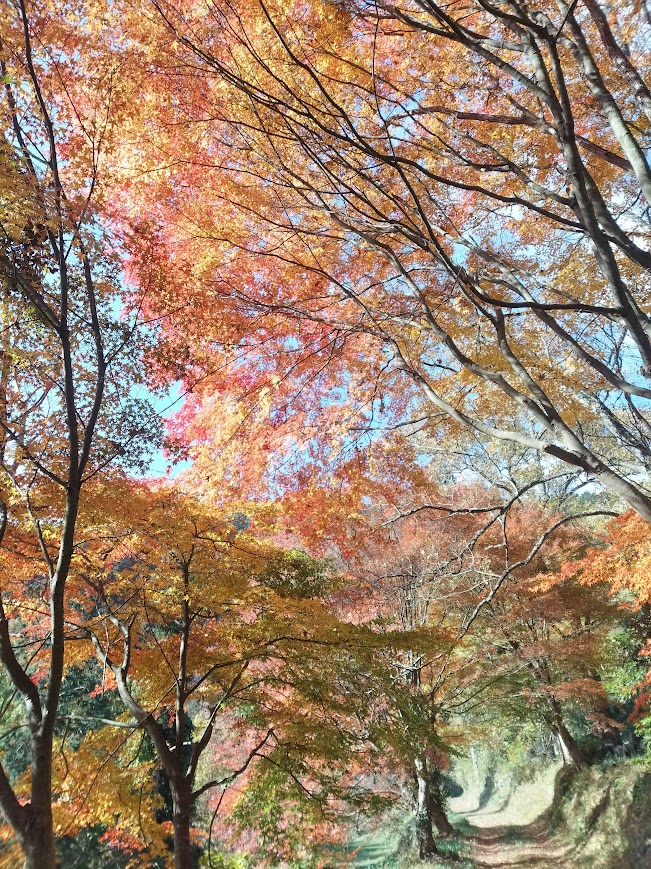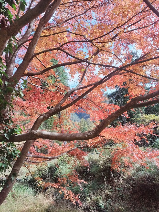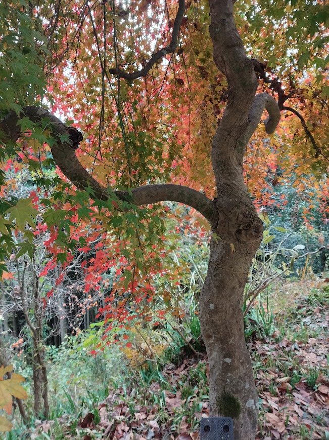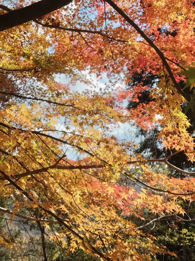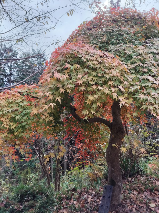 最後の紅葉、しだれ紅葉は一番最後に紅葉します。もみじの内側から空をみることができます。青から黄色や赤の混じった彩りを見せてくれます。あいにく今日は雲空でしたが、晴れであれば日差しを受けてなんともいえない景色を見せてくれるでしょう。明日は晴れです。どんな景色を見せてくれるでしょうか(^o^)